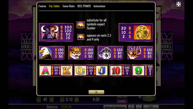 В игровом автомате 5 барабанов, 4 ряда символов и 1024 способа формирования комбинаций. Привычных линий в автомате нет, поэтому ставки делаются сразу на одно вращение. Символами в игре выступают изображения различных животных: волка, орла, лисы, буйвола. Минимальная ставка составляет 10 рублей, а максимальная ставка – 1000 рублей. Призовые комбинации в аппарате формируются, если на активной линии выпали одинаковые символы. Помимо обычных изображений, в автомате есть особые символы. Они могут заменять другие картинки, формировать призовые комбинации и активировать особые функции в игре. Выигрыши в автомате рассчитываются умножением ставки на коэффициент комбинации. Максимальный множитель в игре равен х300. Характеристики игры: